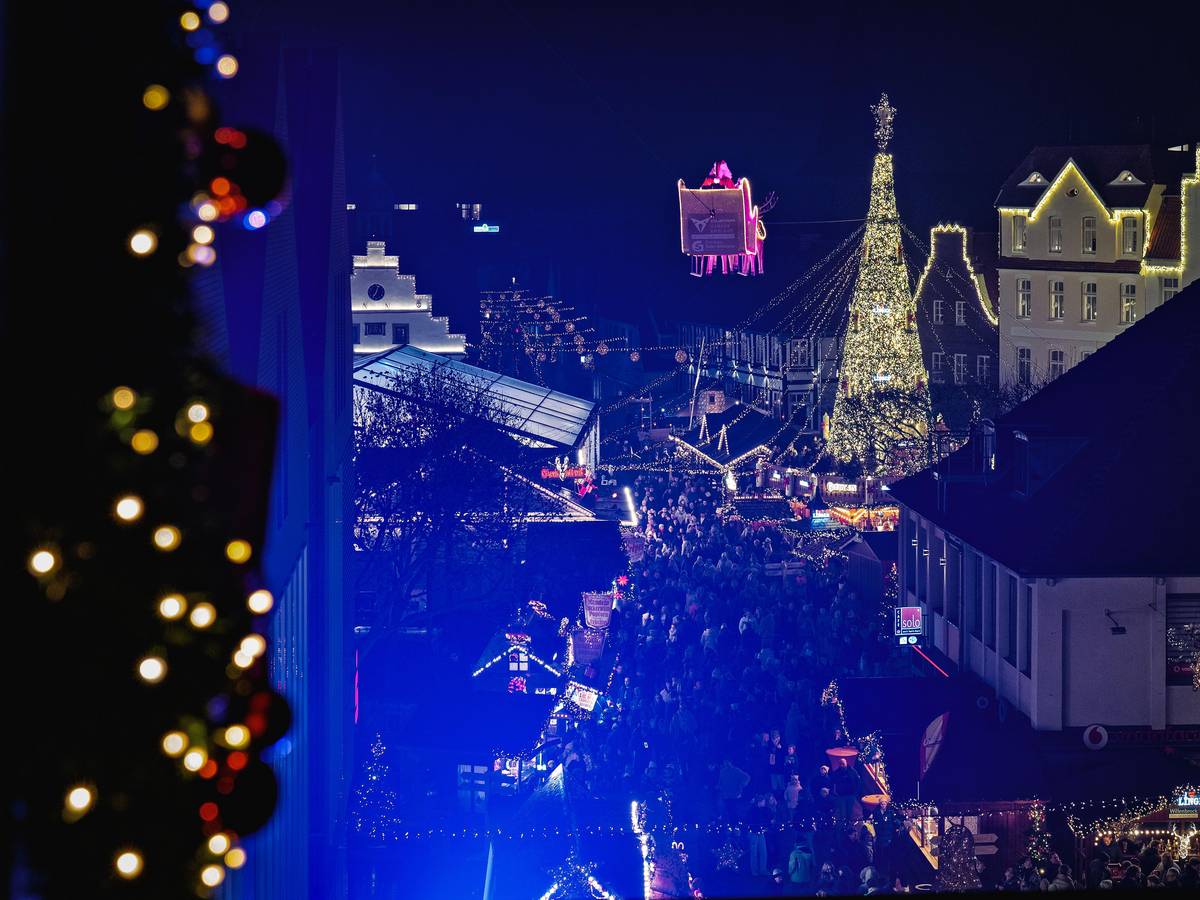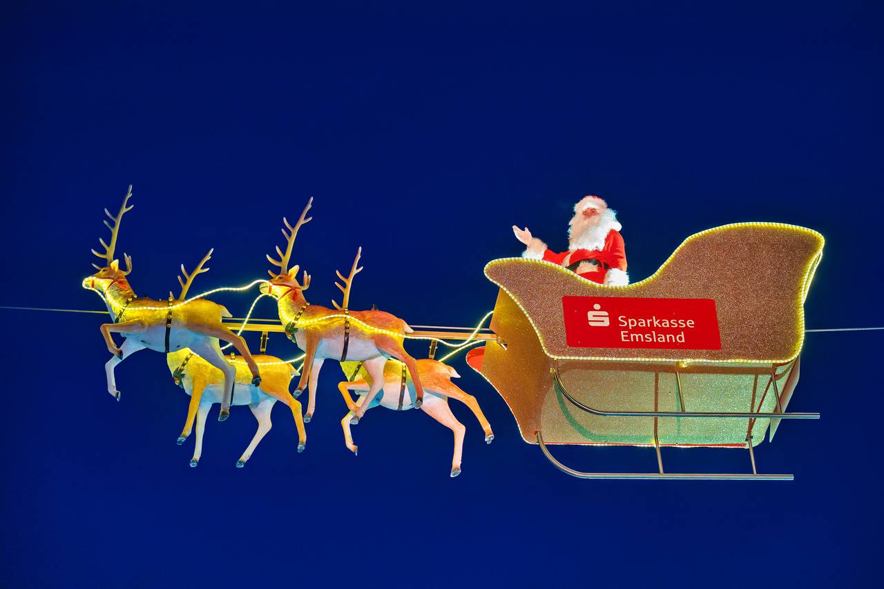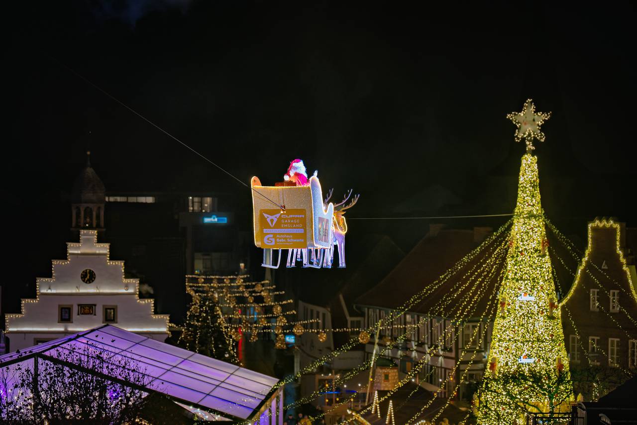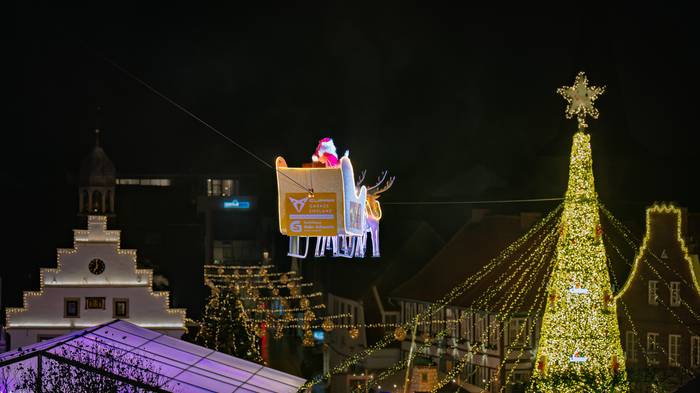 Die Besucher des Lingener Weihnachtsmarktes erwartet 2025 ein unvergessliches Erlebnis: Zum ersten mal fliegt der Weihnachtsmann mit seinem Rauschebart, dem roten Gewand und seinem zauberhaften Schlitten über die Köpfe der Lingener hinweg - und lässt dadurch jeden Tag nicht nur Kinderaugen leuchten.
